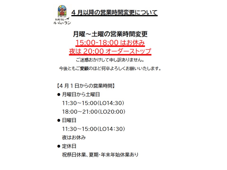 月曜から土曜の15時~18時に中休みをいただきます。 また夜は21時までとなります。20時までにご来店お待ちしております。